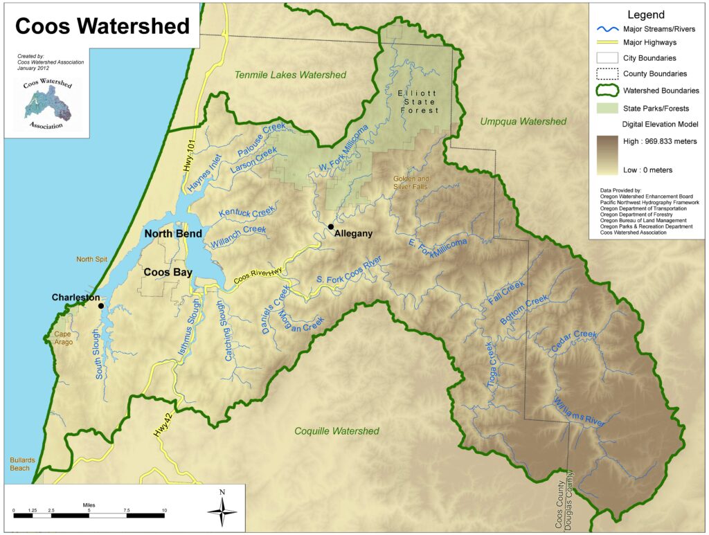 The Coos Watershed Association’s service area is the Coos watershed basin, which is a 610 square mile area that encompasses all the land and waters draining into the Coos estuary and ultimately the Pacific Ocean. There are two other watersheds in Coos County: the Tenmile Lakes watershed north of us also drains to the Pacific Ocean, as does the Coquille watershed to the south. The Coos watershed is home to many different plants, animals, and people.