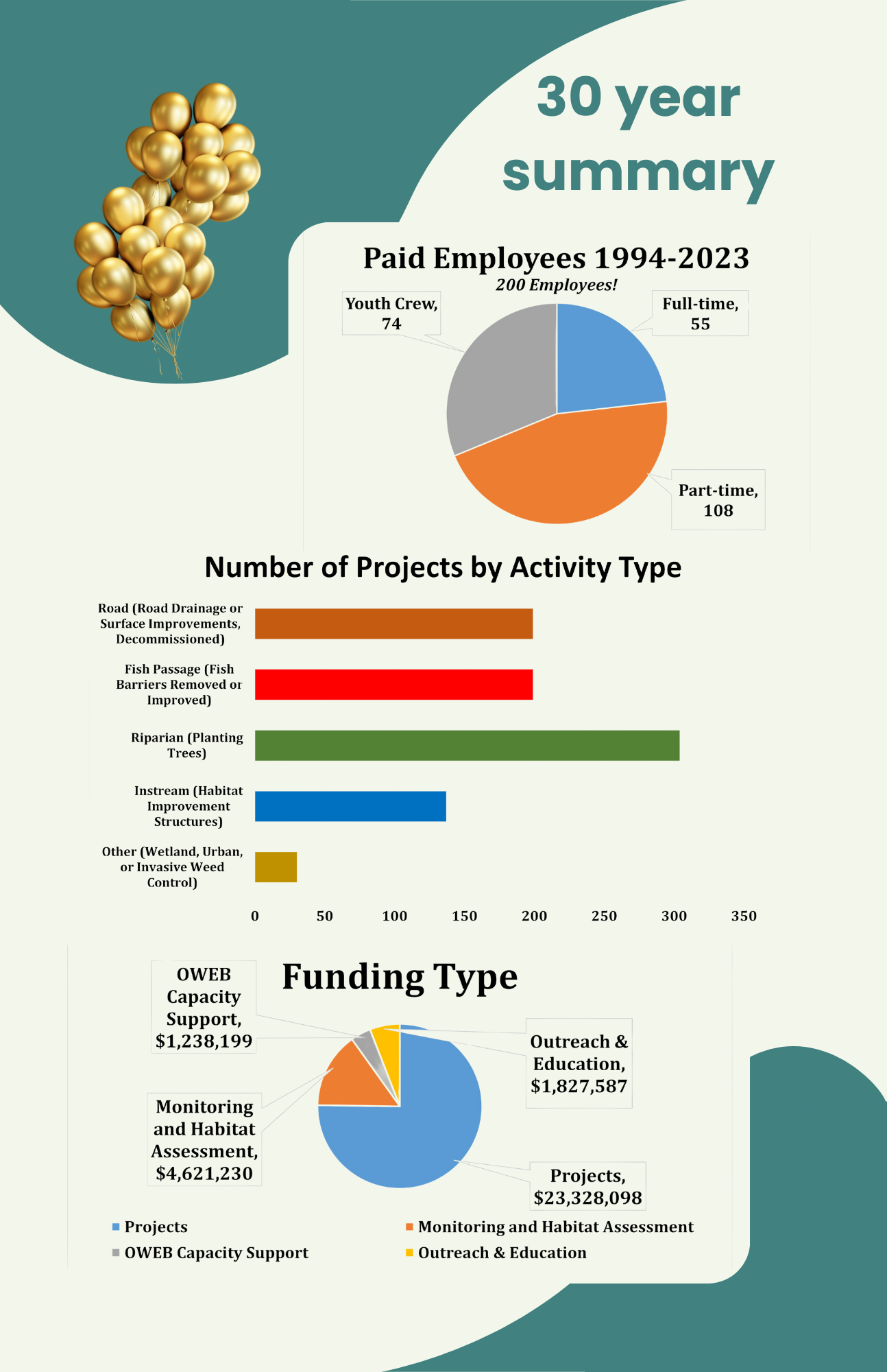 Over the years, we have worked hard to earn the trust and confidence of a wide variety of landowners and land users, and serve as a helpful bridge between the private sector, regulatory agencies, and local governments. We have expanded the size and expertise of our team as well as the type and complexity of projects we take on, and are always looking for new and creative ways to meet the changing needs of our watershed community. As of 2024, CoosWA has attracted and expended $31,015,114 in the watershed, with most of that money going to local contractors and suppliers. Click here for a summary of our accomplishments over the last 30 years!